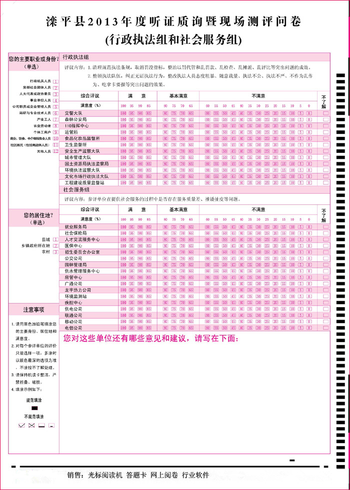 品科閱卷機的使用范圍:主要應(yīng)用于國內(nèi)外考試評卷、考試報名、志愿統(tǒng)計、各行各業(yè)的干部測評、考核、選舉、數(shù)據(jù)采集。現(xiàn)在品科的光標(biāo)閱讀機產(chǎn)品已經(jīng)在全國30幾個省市的重點初中、重點高中、重點大學(xué)使用開了。給廣大用戶提供了方便快捷,售后服務(wù)周到的印象。